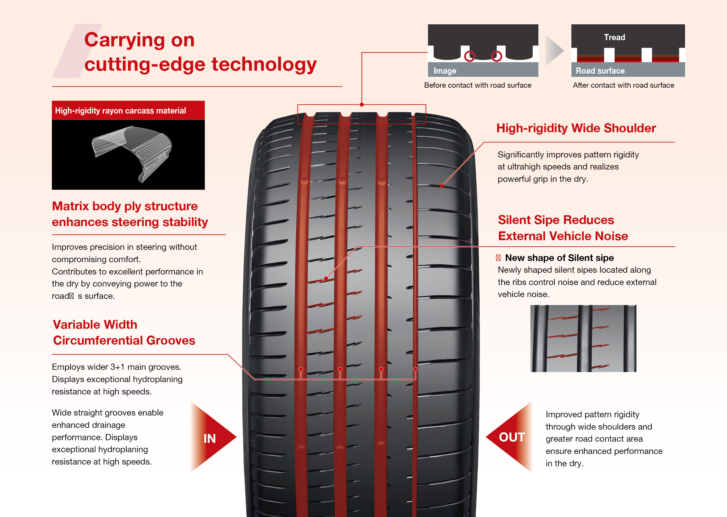 Contributes to excellent performance in the dry by conveying power to the road’s surface.