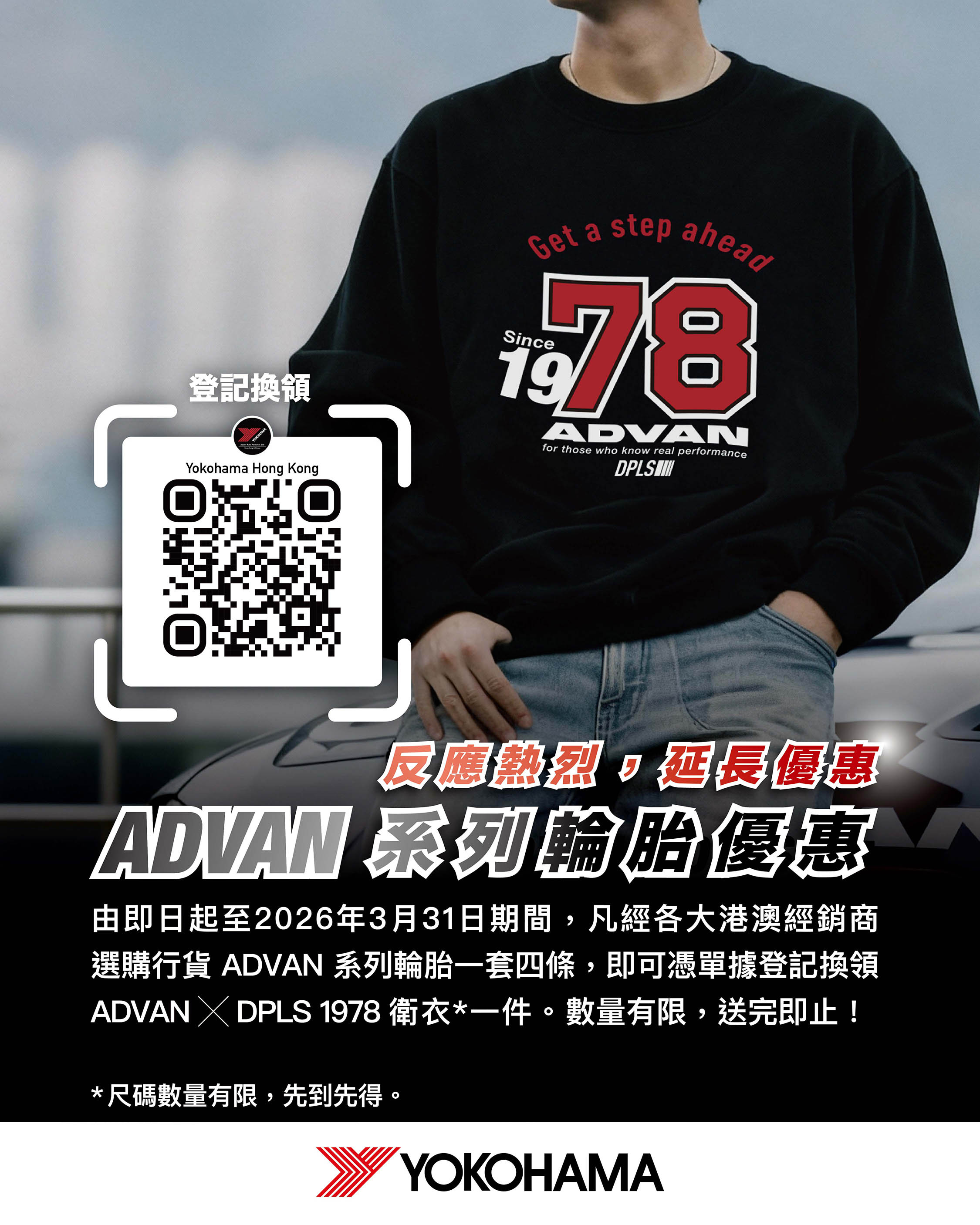 【ADVAN 系列 輪胎優惠】港澳同步 即日起至2026年3月31日,凡經港澳各大經銷商選購 ADVAN 系列行貨輪胎一套四條,即可憑單據登記換領 ADVAN x DPLS 1978 衛衣 一件!尺碼數量有限,先到先得,送完即止!